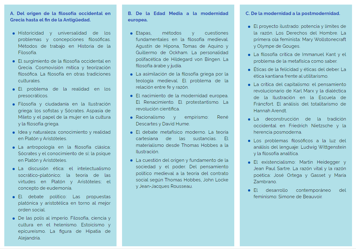 Fig. 5. Saberes básicos de la materia de Filosofía de 2º de Bachillerato (extraído de /educagob.educacionyfp.gob.es)