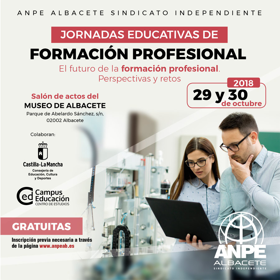 Campuseducacion.com colabora con ANPE Albacete en las Jornadas Educativas GRATUITAS de Formación Profesional dirigidas a todo el profesorado en general tanto funcionarios de carrera como interinos de centros públicos o privados, a opositores y a titulados universitarios, y especialmente a aquellos docentes implicados en la impartición de cualquiera de los módulos, ciclos y familias profesionales de Formación Profesional, así como maestros, profesores o alumnos interesados.