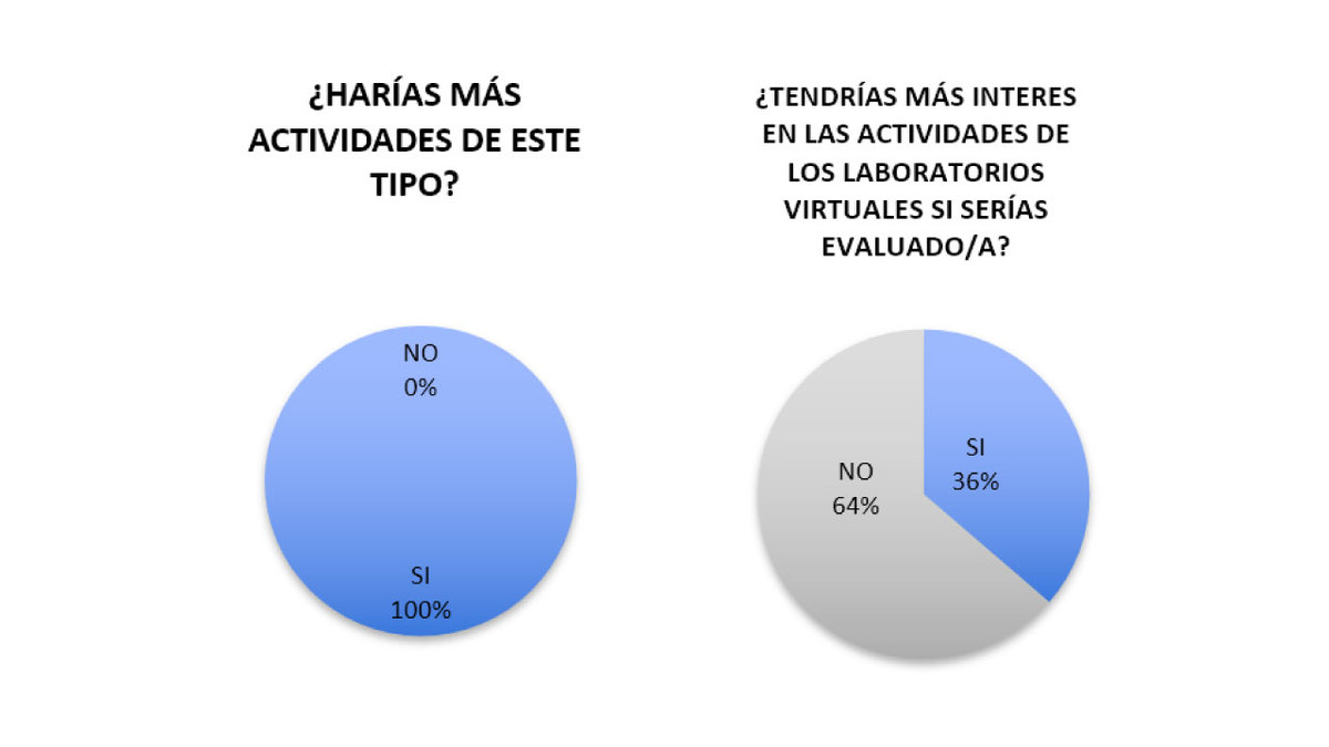 Tras las actividades, la totalidad del alumno manifestó su predisposición a volver a realizar más tareas mediante el uso de los laboratorios virtuales. No obstante, se comprobó que un 64% de los estudiantes no mostrarían mayor interés en las actividades experimentales virtuales en el hipotético caso de que supiesen que serían evaluados sobre el conocimiento en el uso de los mismos, así como sobre los conceptos experimentales.